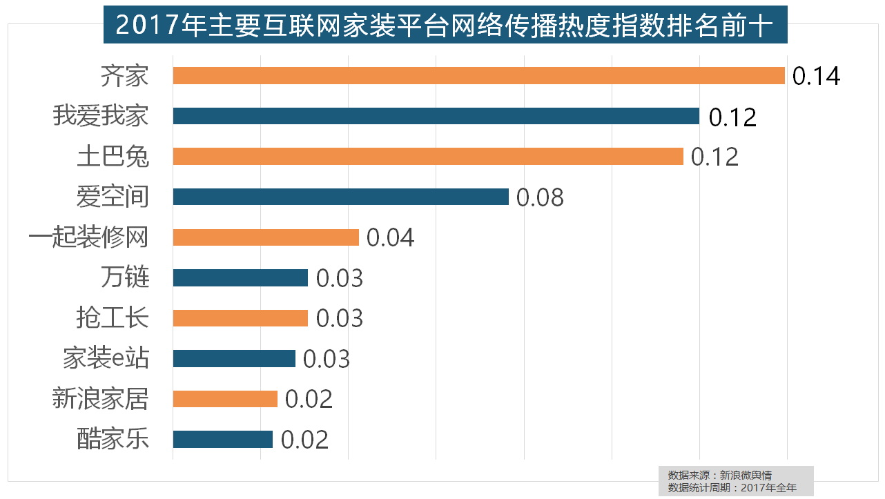 除各保守家拆设想企业逐鹿我国度拆市场外,近年来,一众互联网家拆平台也前来分一杯羹。据新浪微舆情对我国次要互联网家拆平台大数据阐发显示,2017年,齐家、我爱我家、土巴兔、爱空间、一路拆修网的收集热度指数排名前五,万链、抢工长、家拆e坐、新浪家居、酷家乐正在年度互联网家拆平台热度榜上排名第六到第十位。