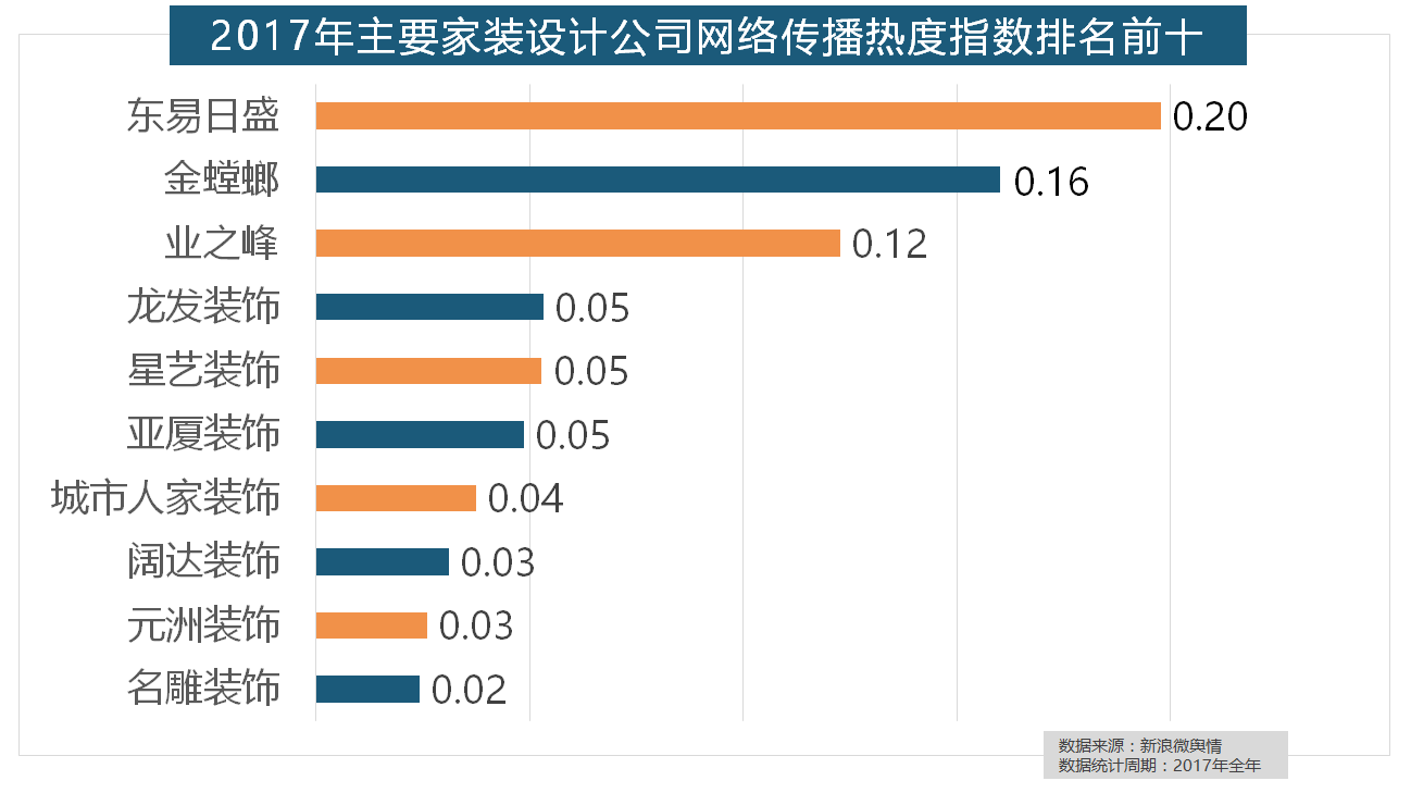 伴跟着我国度拆市场的繁荣,一批具有必然规模的家拆设想公司也纷纷出现。据新浪微舆情对2017年我国次要家拆设想公司大数据阐发显示,东易日盛正在过去的一年中收集热度指数最高,金螳螂、业之峰、龙发粉饰、星艺粉饰紧随其后。此外,名雕粉饰、亚厦粉饰、城市人家粉饰、阔达粉饰、元洲粉饰也榜上出名,位列年度家拆设想公司热度排行榜六至十位。